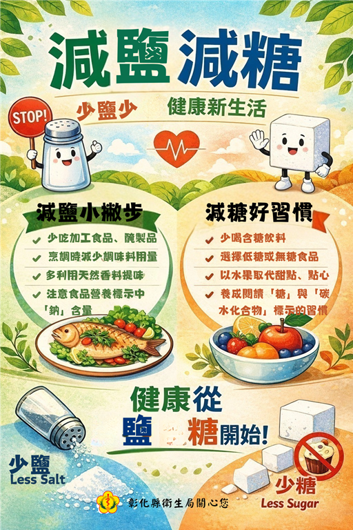 減糖減鹽有助維持健康。少糖可穩定血糖、預防肥胖與脂肪肝,並降低糖尿病與心血管疾病風險;少鹽能幫助控制血壓、減少水腫,減輕腎臟負擔。從今天開始,為飲食做出小小改變,減鹽減糖、均衡攝取,讓身體更輕盈、生活更有活力,為健康打下穩固基礎。